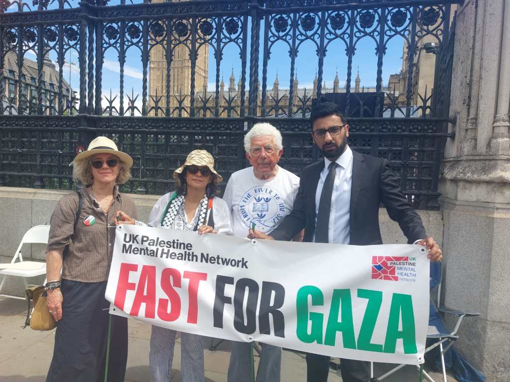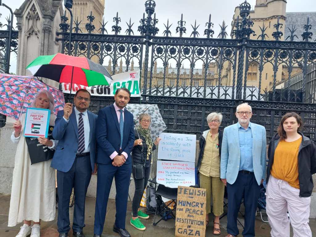 The UK-Palestine Mental Health Network FAST FOR GAZA outside Parliament.Jeremy Corbyn at FAST FOR GAZA on Tuesday 1 JulyMPs Richard Burgon, Imran Hussein and Ian Byrne at FAST FOR GAZA