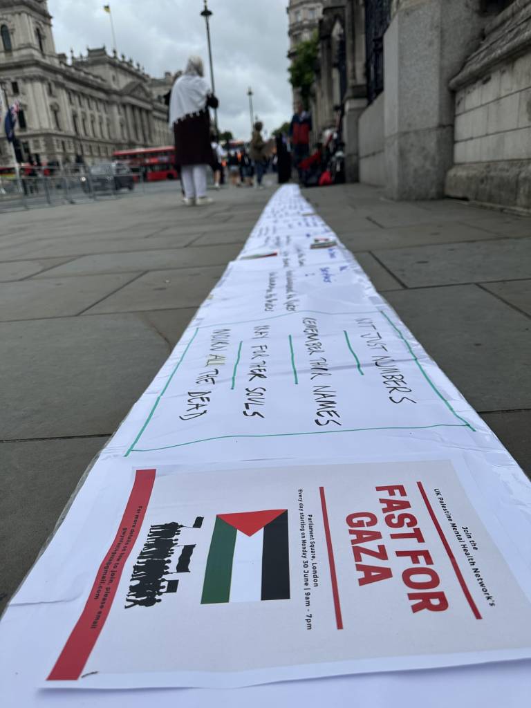 Steve visiting #FASTFORGAZA outside ParliamentThe list of Gazans killed on one day. Prepared by Jane Hughes ( Monday 7th)