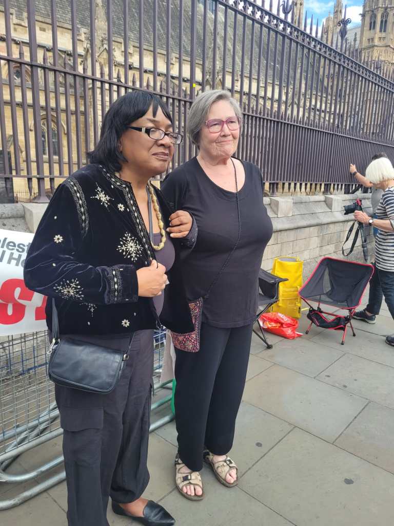 Diane Abbot, MP, speaking outside Parliament at #FASTFORGAZADenise Gough and Liz Edwards at #FASTFORGAZA outside ParliamentQian, Selma Alan ( front) Liz, Sarah and two other activists (rear)