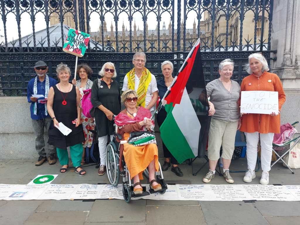 A Buddhist group offering a prayer for Gaza outside Parliament at #FASTFORGAZAJenny Stanton at #FASTFORGAZA outside ParliamentNicola and Robin outside Parliament at #FASTFORGAZANicola Jenny and Pam at #FASTFORGAZA outside Parliament
