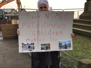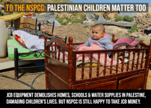 This was the first day of a national conference organized by the NSPCC. In the advert, NSPCC asserts ‘Every Child has the Right to Grow up Safely’, and the campaign response was ‘How Safe are Palestinian Children?’ Our demand was that NSPCC stop taking money from JCB; the values of the company are totally at variance with the stated values of the charity.